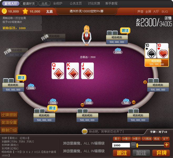2、从小盲注玩家按顺时针方向做同于第一轮的行动,直到不再有人弃牌,且每人已向奖池投入相同注额。已弃牌玩家不再有行动权。